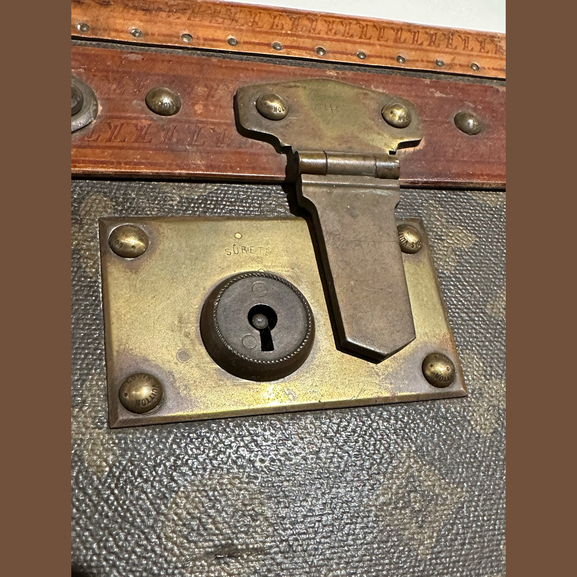 The trunk features original leather trim, brass lock and corner mounts, and sturdy wood slats that frame the structure with strength and sophistication. Of special note, this example retains its original keys, an increasingly rare detail that heightens its appeal to collectors. The locks are labeled "Surety" meaning safety in French. This lock was developed by George Vuitton in 1886. Its scale makes it particularly desirable. Substantial enough to serve as a coffee table or decorator’s centerpiece, while retaining portability and versatility.
