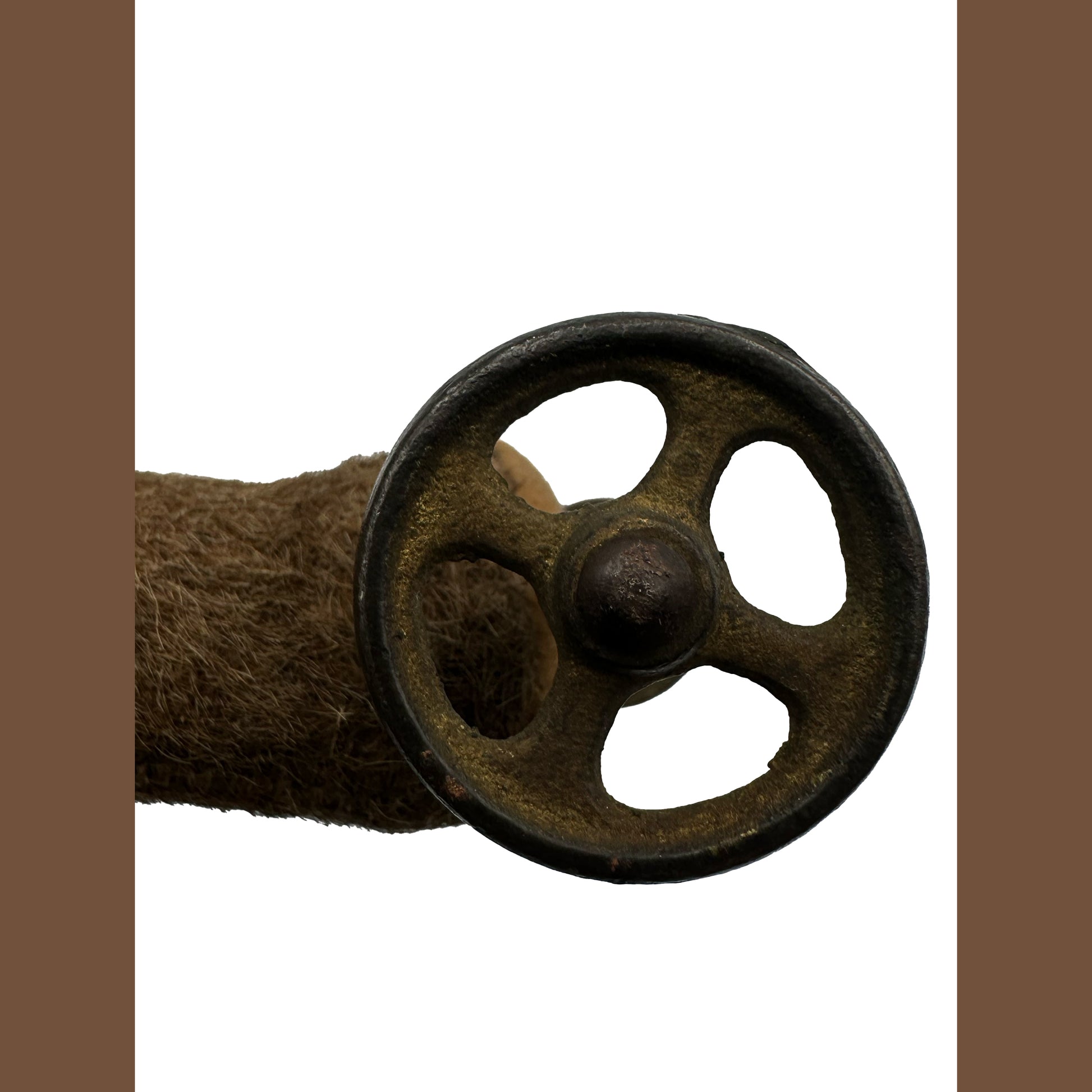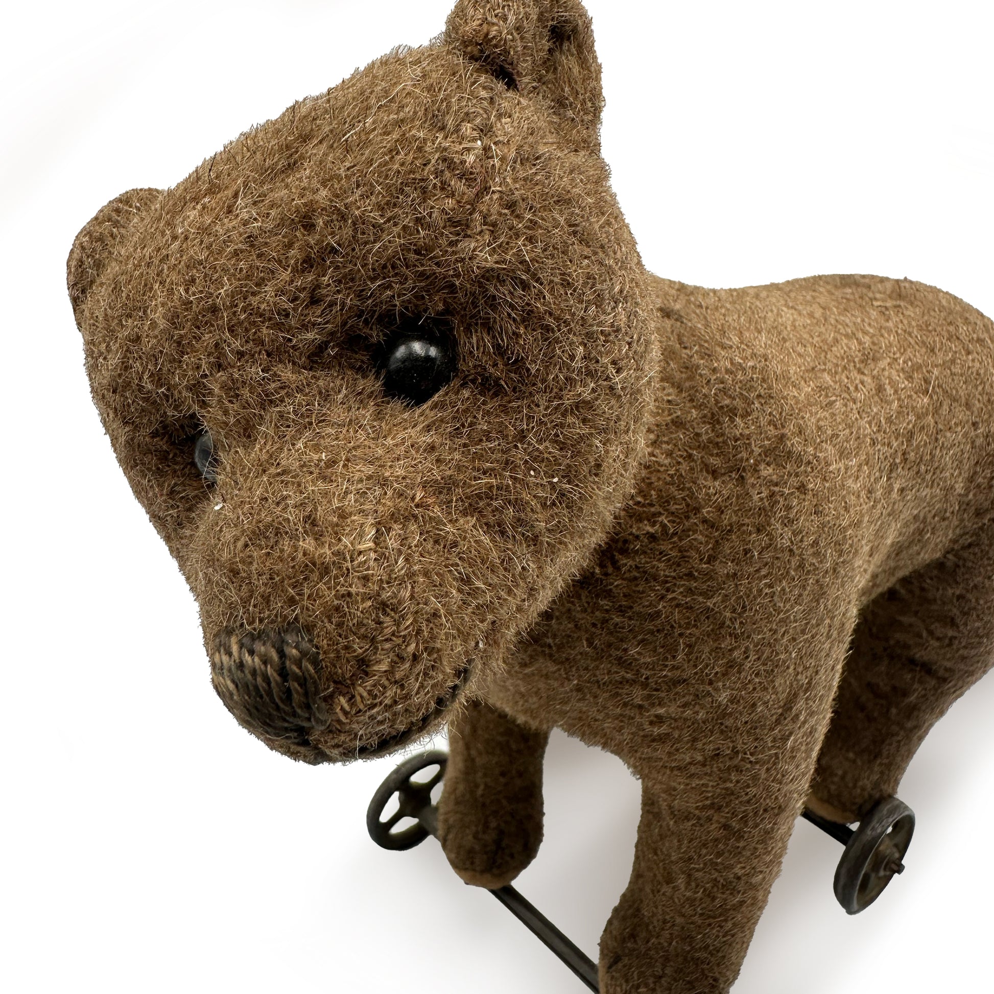 Supported on four cast-iron spoked wheels with its original metal axles, the piece moves smoothly and displays beautifully. The form captures Steiff’s earliest animal silhouette: lean, alert, and full of subtle character. The surface shows even age toning and expected wear consistent with its age, lending a warm, time-softened finish.