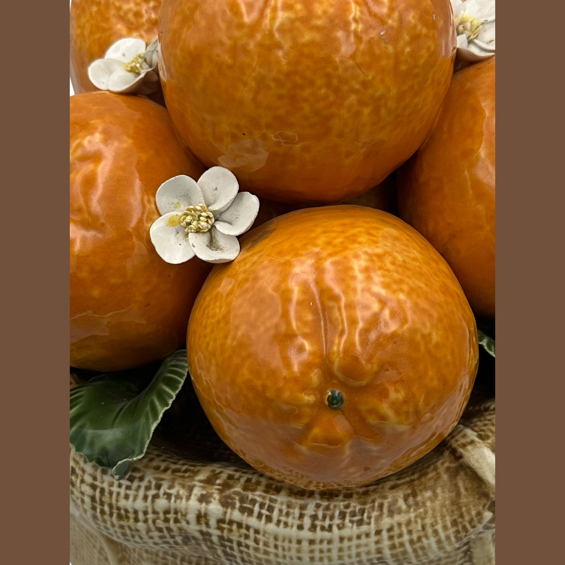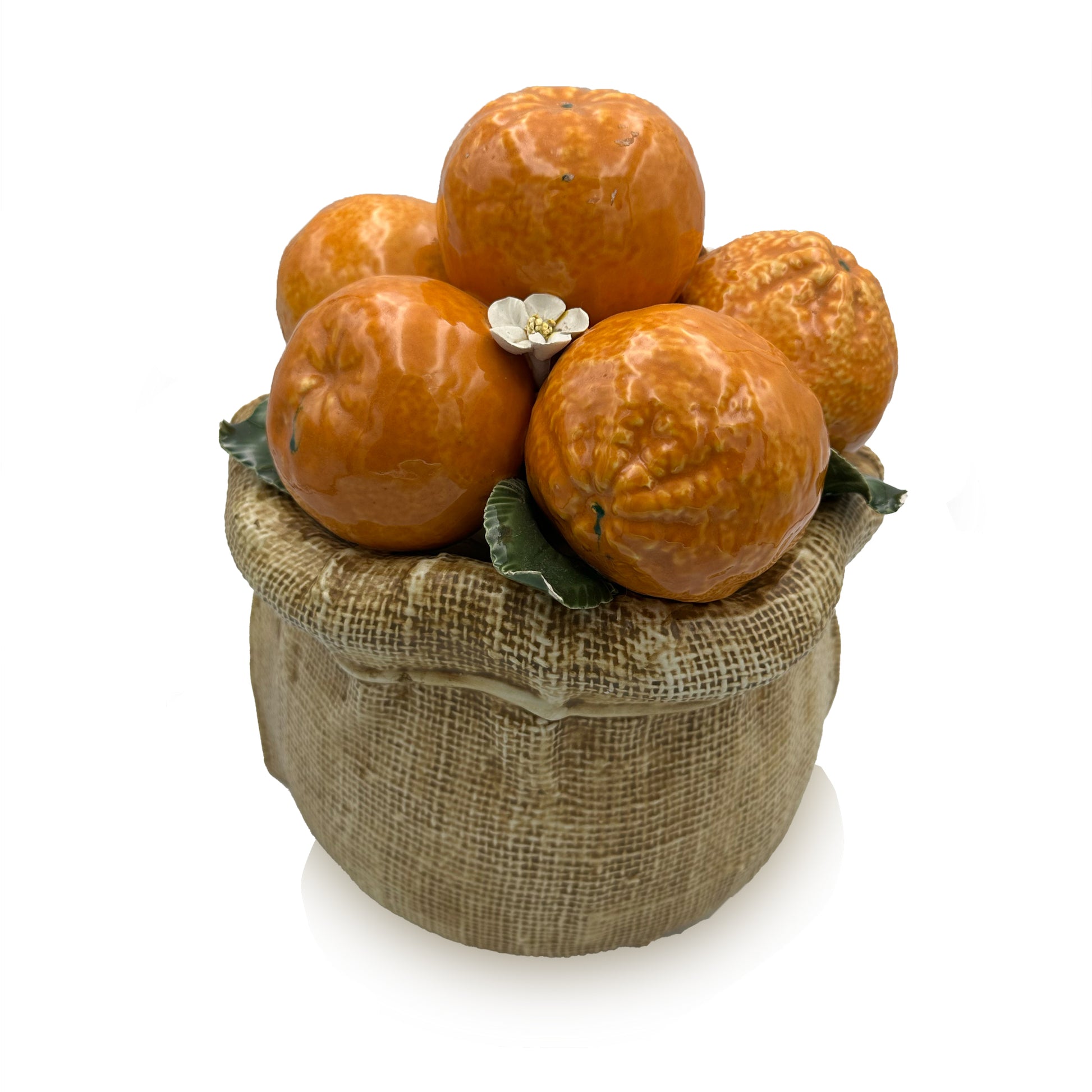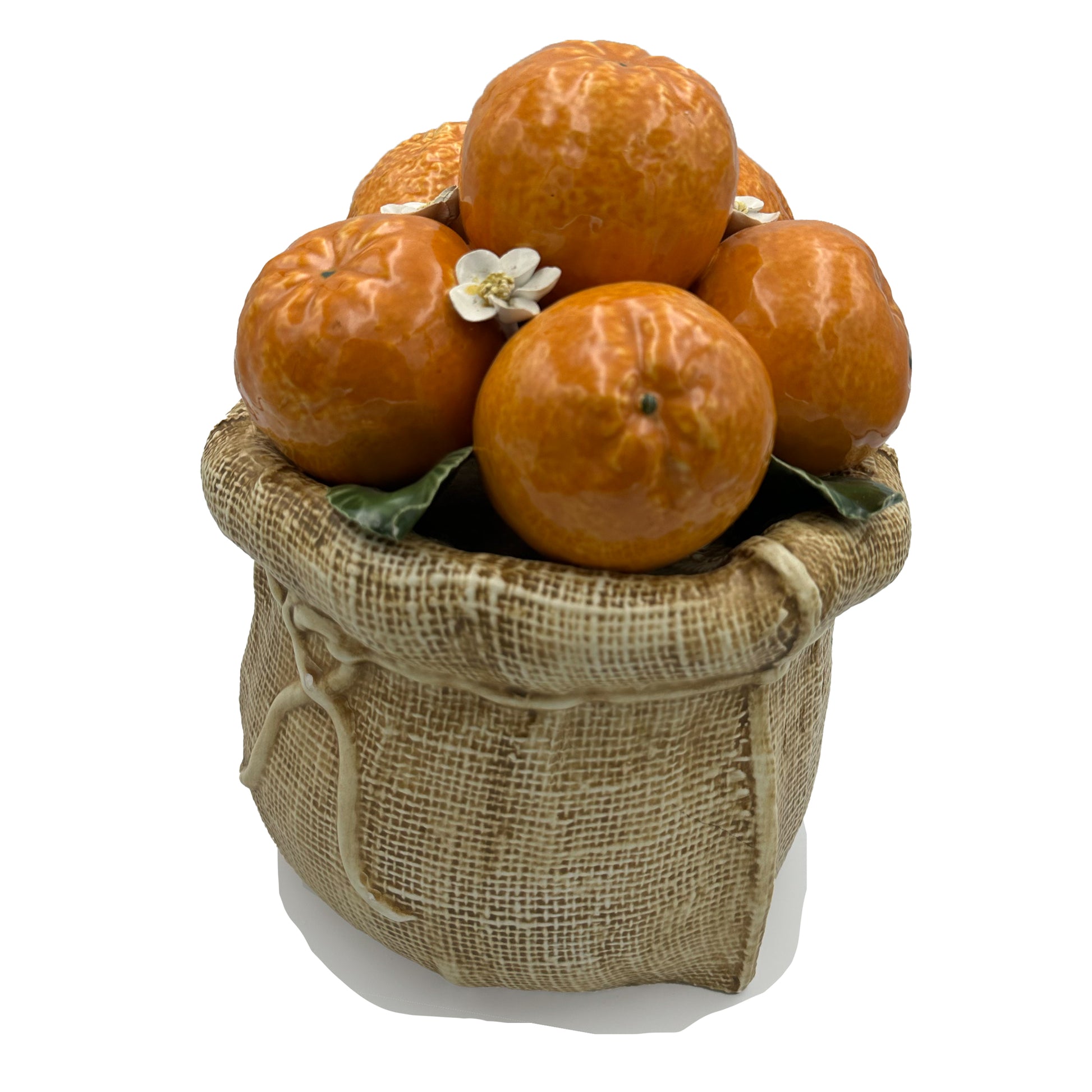 A charming vintage Italian ceramic still life featuring a cluster of glossy, hand-glazed tangerines nestled into a beautifully sculpted burlap sack. Each fruit is richly detailed, with lifelike dimpling, deep orange glaze, and hand applied green leaves. Delicate white citrus blossoms with gilt centers add an elegant, uplifting touch.