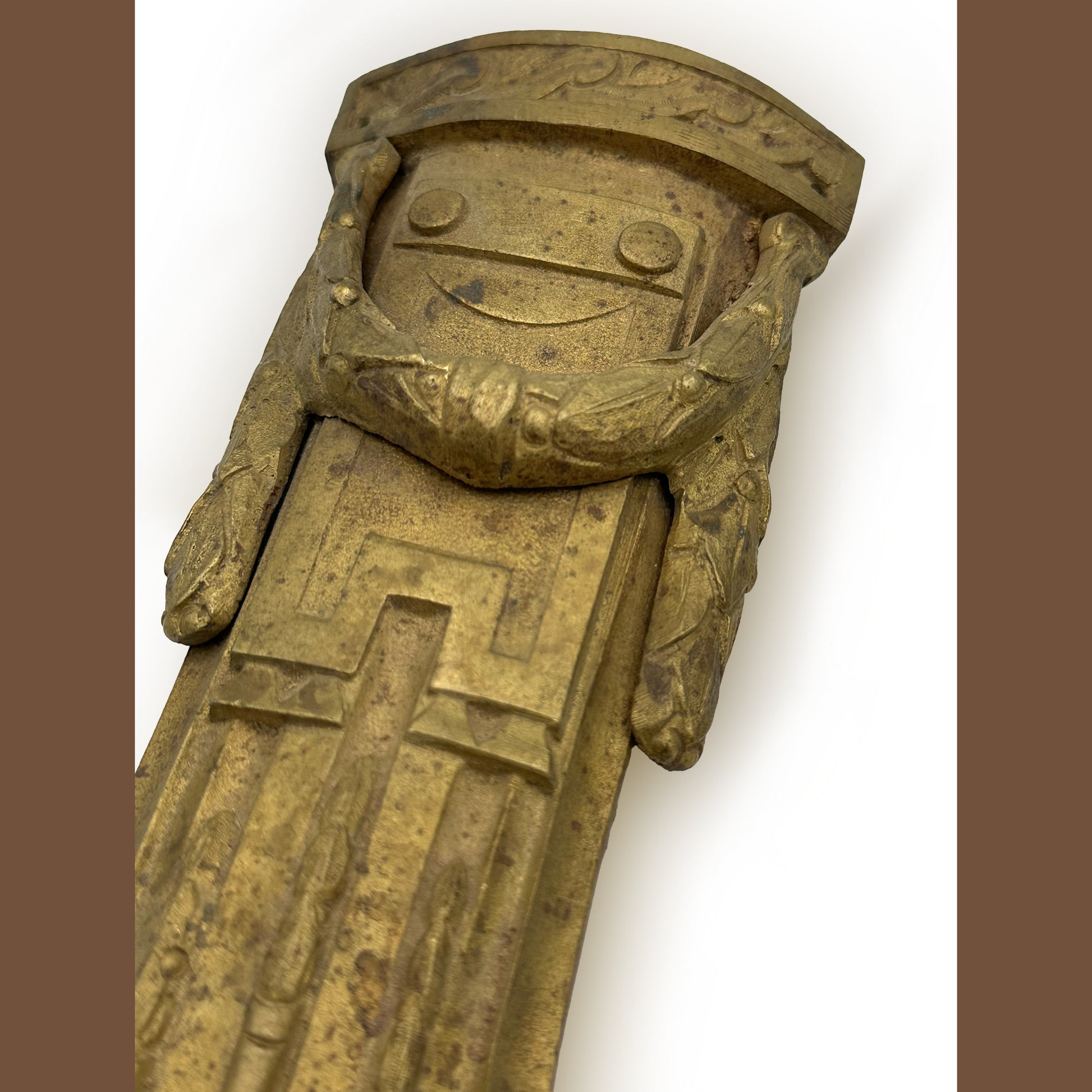 A striking pair of solid brass architectural salvage mounts, richly detailed with classical motifs. Each piece features a vertical column design with stylized laurel wreaths, acanthus flourishes, and geometric reliefs, suggestive of late 19th to early 20th century neoclassical revival style.